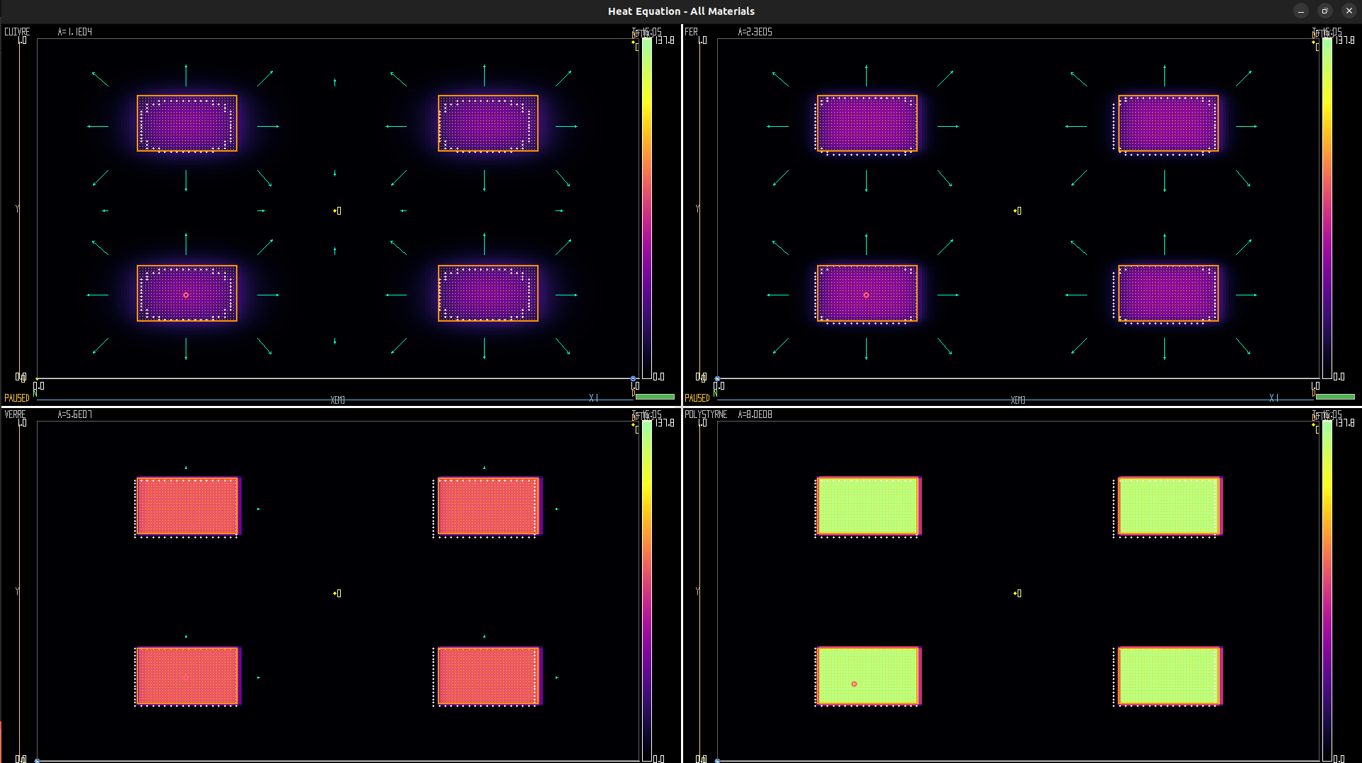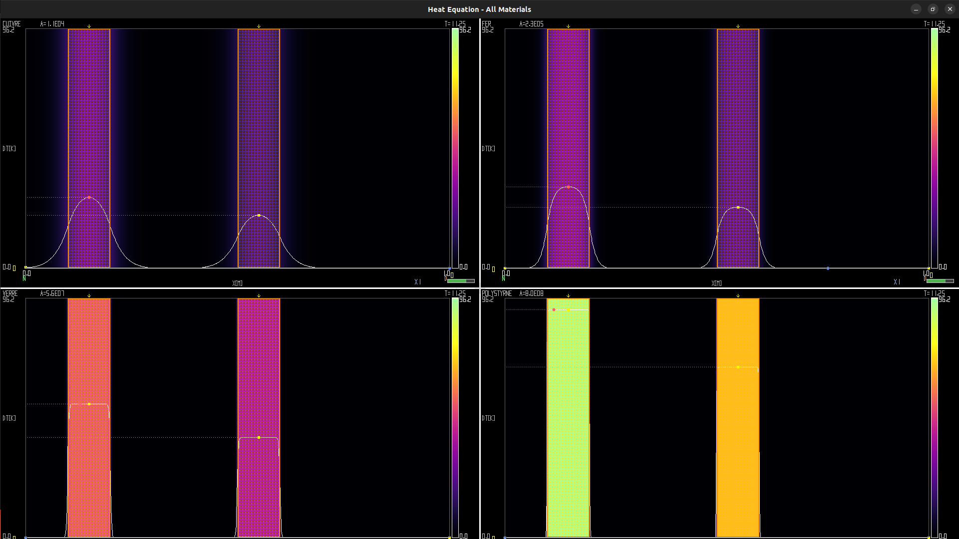 This project simulates heat diffusion through materials using the heat equation, a fundamental partial differential equation (PDE) in physics. The simulator supports both 1D (bar) and 2D (plate) scenarios with real-time visualization of temperature distribution across four different materials simultaneously.